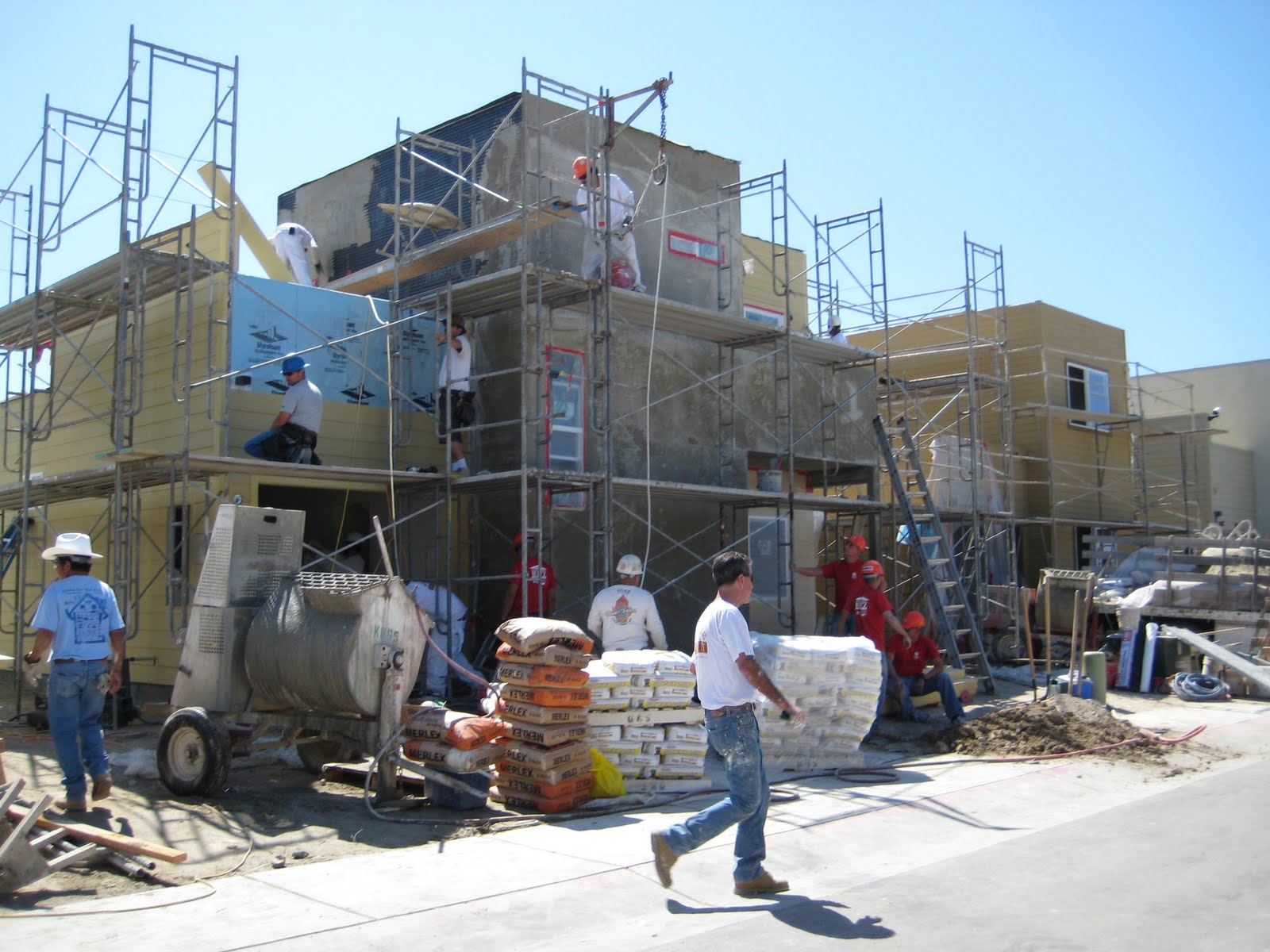 By the middle of the day, the cabinets were being installed, the siding and stucco were nearly completed and they were preparing to tile the countertops and floors and install the carpet.